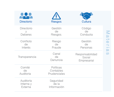 Nuestro modelo aborda tres ejes (Directorio, Riesgos y Cultura), que comprenden acciones esenciales en las siguientes materias: